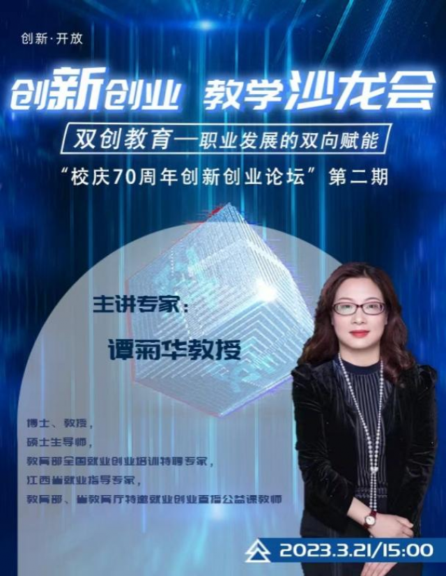 3月21日下午,“创新创业教学沙龙会”第二期在红角洲校区创客实验室2105举办,本次沙龙邀请到教育部全国就业创业培训特聘专家、江西师范大学谭菊华教授作题为“双创教育-职业发展的双向赋能”的讲座,学校承担创新创业教育教学的40余名教师参加。